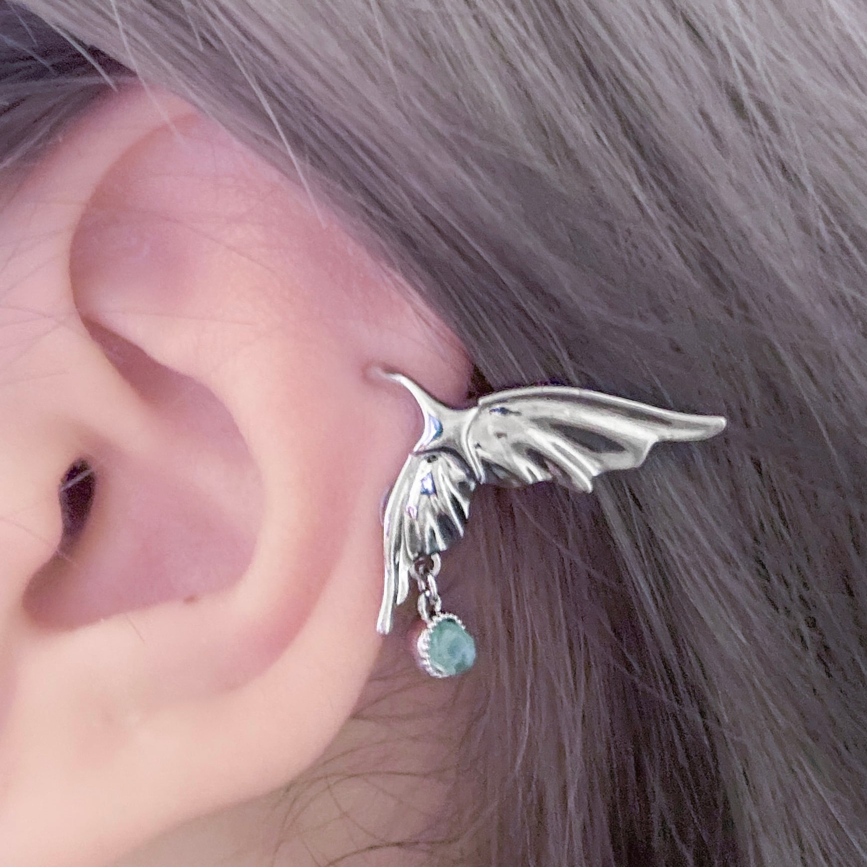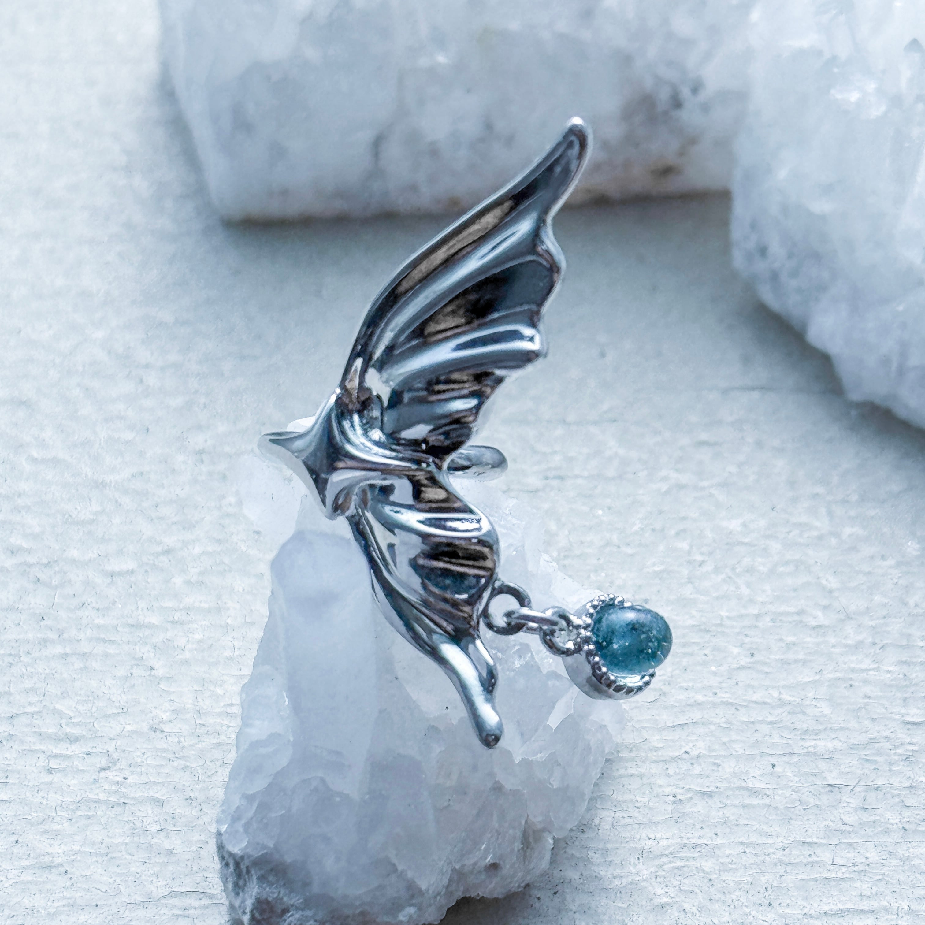 人魚の鰭を模った、耳に挟んで装着するタイプの装身具です。ミル打ち枠にシーグラスがはめ込まれたチャームが動くたびきらりと揺れます。