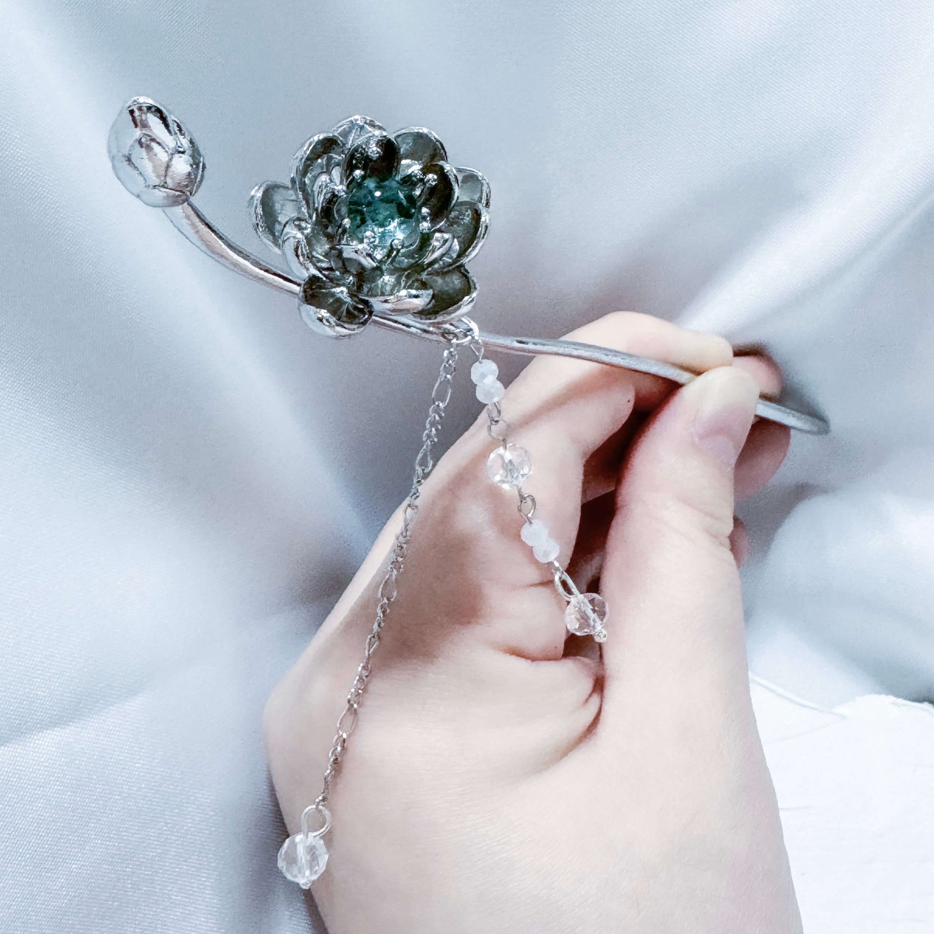 こちらが柔らかい金属でできているため、このかんざしのみで髪を結うと曲がってしまう恐れがあるとのご指摘をいただきました。